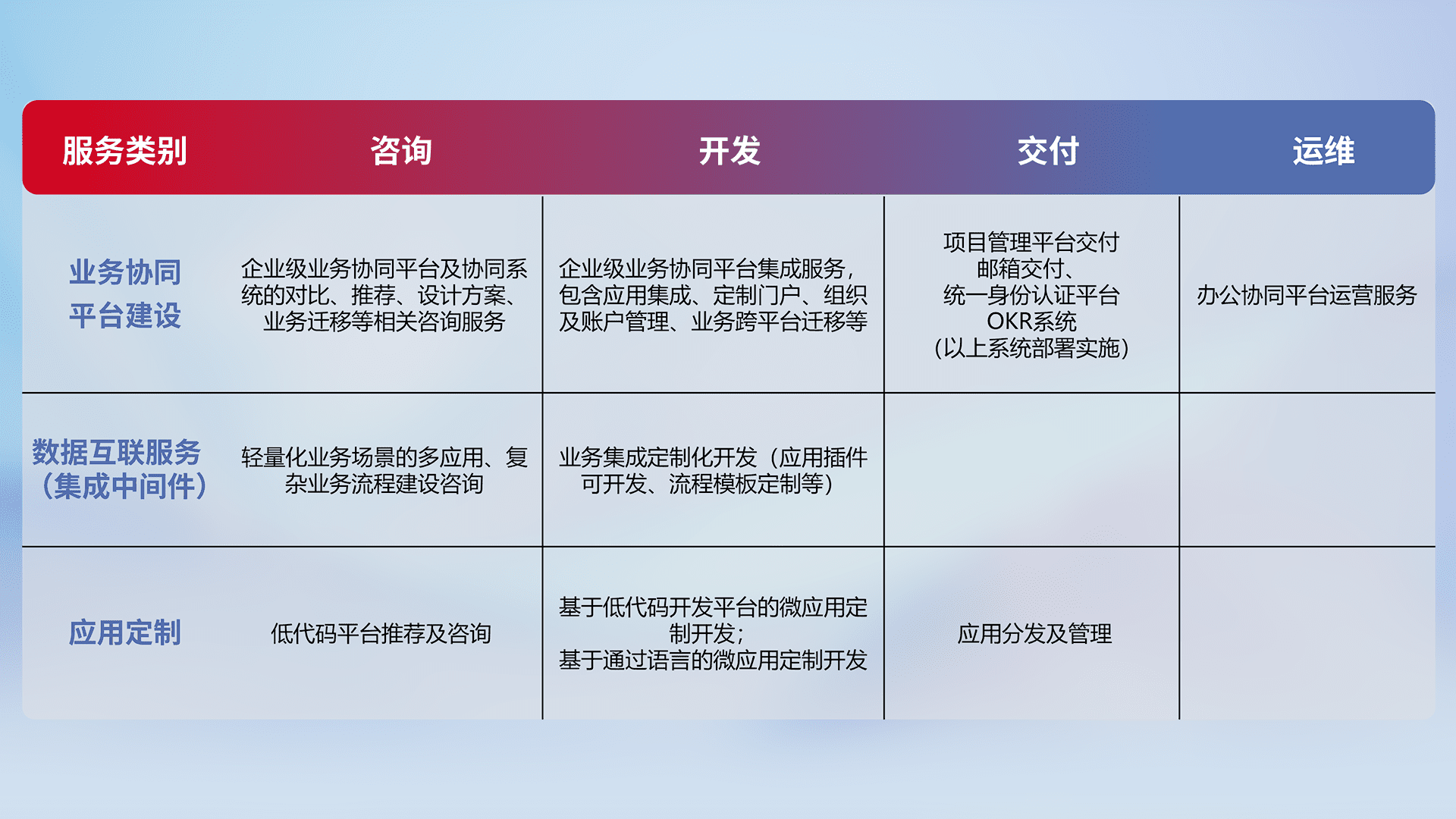 针对钉钉、、企微、、、IDaas等平台级产品提供产品的规划、、方案、、、交付、、、定制化开发等服务,,实现如统一协同办公、、、智能客户服务、、混合会议管理、、、智能数据查询、、、、等业务场景,,,,实现数字化转型。。