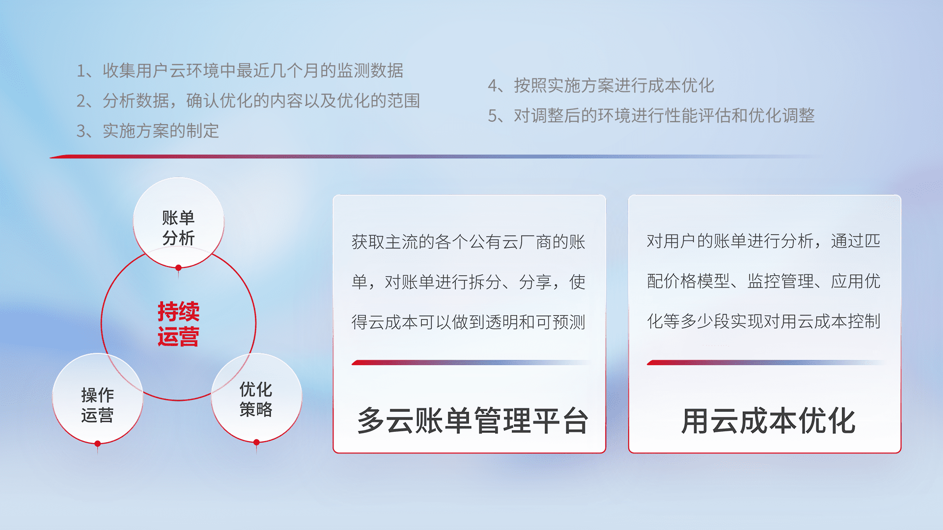 通过多云纳管,,,以统一的资源数据模型把客户的云资源进行抽象和封装,,进而实现对多云资源的统一操作,,保障云资源管理的可靠性、、、稳定性与可用性。。。量身定制化运维内容,,,配置、、开发运维、、、补丁管理、、备份、、、监控、、认证和访问管理、、、审计和日常巡检等,,保障在用云过程中的可靠度,,,,稳定度以及高可用率。。。。