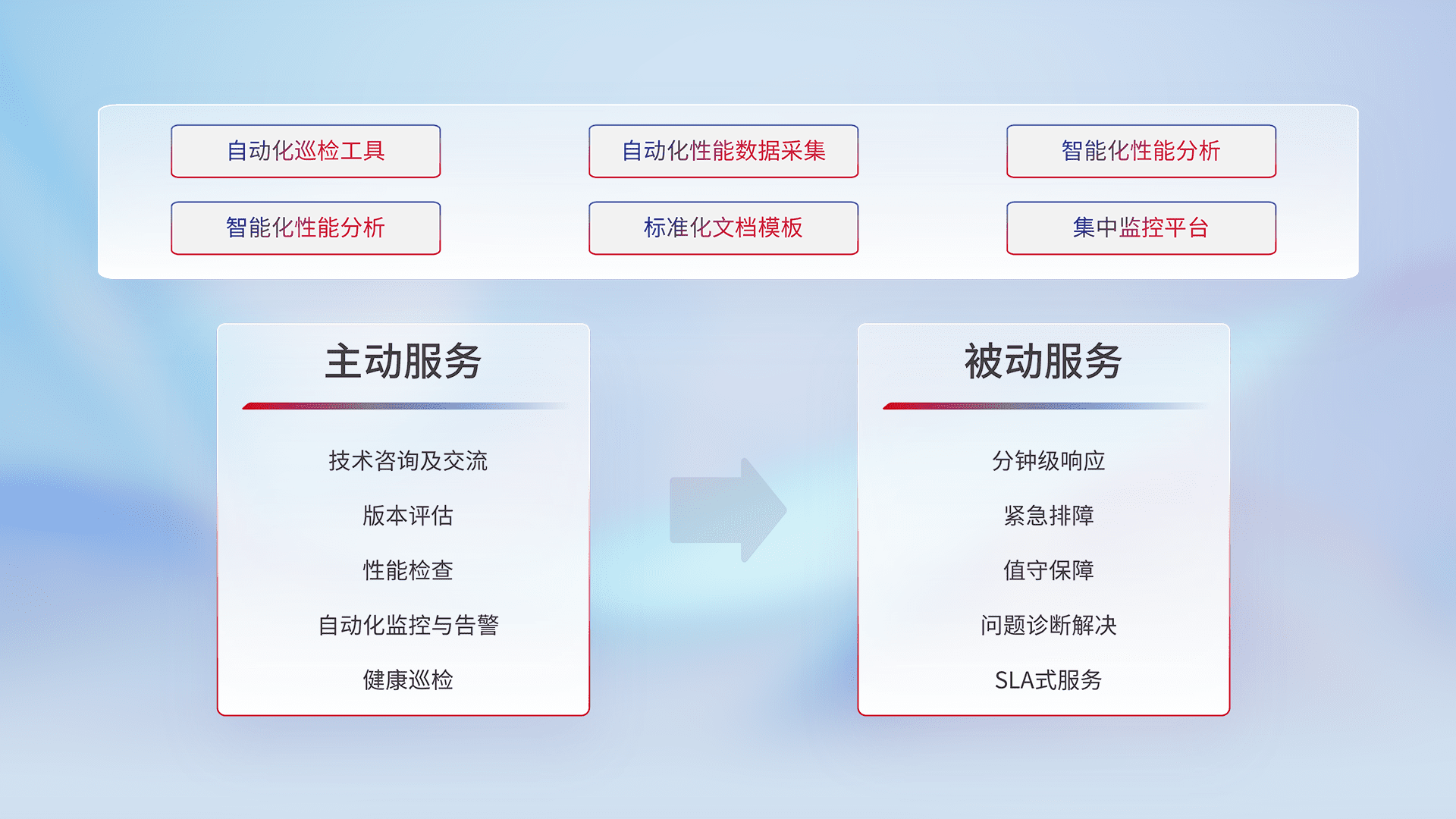 智能化工具和标准化文档,,,,保障服务质量,,提供主动服务(包含技术咨询、、版本评估、、、性能检查、、自动化监控与告警、、、健康巡检)和被动服务包含(分钟级响应、、、紧急排障、、、、值守保障、、、问题诊断解决、、SLA服务)。。。。